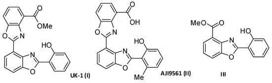 Derivatives of 2-(2-hydroxyphenyl)-bis(benzoxazole) UK-1 (I) and AJI9561 (II) (Figure 1), being natural products isolated from the strain of Streptomyces, are known as anticancer agents [8,9]. UK-1 exhibits a significant cytotoxic activity against HeLa, P338, B16; the other, AJI9561 against Jurkat and P388 cancer cells. Many analogs of UK-1 were designed and obtained as potential anticancer agents [10]. Lower activity was found for simplified 2-(2-hydroxyphenyl)benzoxazole III (Figure 1) and its analogs. They showed cytotoxic properties against the breast cancer cells MCF-7 and the lung cancer cell line A549 at the level of 5–20 µM [8,11]. The other derivatives, 2-amino-aryl-7-aryl-benzoxazoles, exhibit prominent cytotoxic effects towards the human A549 lung cancer cells (EC50 of 0.4 µM) [12].