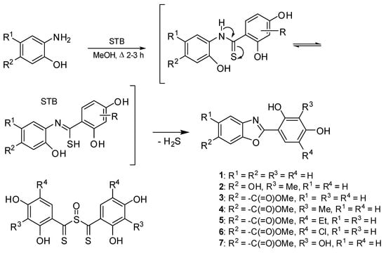 Prompted by the described findings, new benzoxazoles and naphthoxazoles with two hydroxyl groups on the 2-aryl ring were designed and prepared. Our studies with sulfinylbis[(2,4-dihydroxyphenyl)methanethione] (STB) [34] showed its high cyclizing potential. Therefore, we attempted to use STB with 2-aminophenols and other similar reagents in the cyclization reaction.
