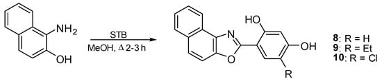 Procedure for the synthesis of compounds 8–10. A mixture of 1-amino-2-naphthol hydrochloride (1.3 mmol) and the corresponding STB (1.3 mmol) in MeOH (7 mL) was heated to reflux for 3.5–4 h (Figure 3). The hot mixture was filtered and the filtrate concentrated. Finally, the compound was recrystallized from MeOH/H2O (3:1) (compounds 8, 9) or from MeOH/H2O (5:1) (5 mL) (10).