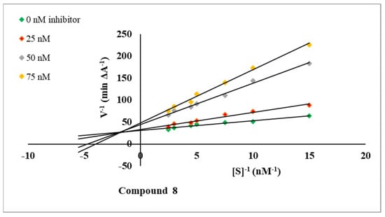 To confirm the mechanism of AChE inhibition, the most active compound 8 was tested in kinetic studies using UV-visible spectroscopy, which is a fast, inexpensive and sensitive method. The experiment resulted in the Lineweaver–Burk plot [43]. The data and the graphical analysis are shown in Table 2 and Figure 4.
