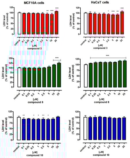 In view of the observed antiproliferative activity, the influence of the tested compounds on the normal human cells—normal mammary gland epiterial cells of the MCF10A line and the normal keratenocytes HaCaT line—was examined (Figure 5). The cells were treated with compounds 3, 8 and 10 in the concentration range from 0.1 µM to 25 µM for 72 h, after which the cell viability was tested by analysis of the level of released lactate dehydrogenase (LDH method).