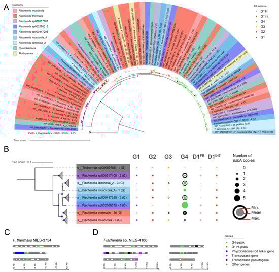 D1 isoforms within the genus Fischerella. (A) Phylogenetic reconstruction of 126 psbA sequences from 48 Fischerella genomes. The outgroups comprised D1 sequences from Gloeobacter violaceus PCC 7421 (NCBI genome ID: GCF_000011385.1), Nostoc sp. PCC 7120 (NCBI genome ID: GCF_000009705.1 and GTDB R202 species Trichormus sp000009705), and Chlorogloeopsis fritschii PCC 9212 (NCBI genome ID: GCF_000317265.1), as well 30 psbD sequences. Branches are colored according to the D1 isoform, while labels are colored according to GTDB R202 Fischerella species, sequences from outgroup genomes, or identical sequences present in more than one species. For collapsed clades, the labels show the number of sequences, number of non-redundant sequences (i.e., identical NCBI protein ID), and number of genomes. Bootstrap support values over 90% are shown as black dots in the tree nodes. (B) Phylogenomic reconstruction of 48 Fischerella genomes and one outgroup (Nostoc sp. PCC 7120). Tree leaves are collapsed at species level and colored according to (A). Bootstrap support values over 95% are shown as black dots in the tree nodes. Theisoform count was performed according to the distribution of psbA sequences in (A), where the outer, middle, and inner circles represent the maximum, average, and minimum number of psbA sequences copies, respectively. (C,D) To analyze the genomic context of the G4 (green) and D1INT (brown) isoforms of the psbA gene from F. thermalis NIES-3754 (C) and Fischerella sp. NIES-4106 (D), a region consisting of 5 genes upstream of the psbA gene, the respective psbA, and five genes downstream of the psbA gene was selected as the genome fragment. Genes are represented by boxed colored as per the legend.
