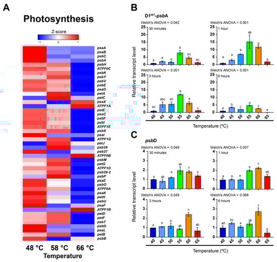 Transcriptional activity of photosynthesis-related genes in F. thermalis at different temperatures. (A) Based on Porcelana metatranscriptomes [19], the transcriptional levels of photosynthesis-related genes were analyzed at 48 °C, 58 °C, and 66 °C. Genes with multiple copies or isoforms and their respective transcript levels were grouped as a single gene. The Z-score color-scale indicates transcriptional levels from low (blue) to high (red). (B,C) The transcriptional levels of psbA (B) and psbD (C) in F. thermalis cultures treated with temperatures from 40 °C to 65 °C (n = 3) were analyzed by RT-qPCR. Relative transcript levels were adjusted to 1 using 40 °C as a reference for each analyzed time. Error bars denote the standard error of the mean (SEM). Barplots are colored for aesthetic purposes. Welch’s ANOVA was used for statistical analysis. Different lowercase characters above each bar denotes significant differences between temperature treatments.