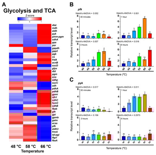 Transcriptional activity of glycolysis-related genes in F. thermalis at different temperatures. (A) Based on Porcelana metatranscriptomes [19], the transcriptional levels of photosynthesis-related genes were analyzed at 48 °C, 58 °C, and 66 °C. Genes with multiple copies or isoforms and their respective transcript levels were grouped as a single gene. The Z-score color-scale indicates transcriptional levels from low (blue) to high (red). (B,C) The transcriptional levels of pfk (B) and pyk (C) in F. thermalis cultures treated with temperatures from 40 °C to 65 °C (n = 3) were analyzed by RT-qPCR. Relative transcript levels were adjusted to 1 using 40 °C as reference for each analyzed time. Error bars denote the SEM. Barplots are colored for aesthetic purposes. Welch’s ANOVA was used for statistical analysis [19]. Different lowercase characters above each bar denotes significant differences between temperature treatments.