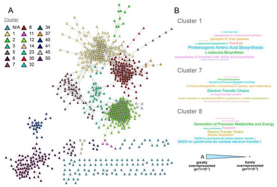 Gene co-expression network and overrepresented metabolic pathways. (A) The gene co-expression network was reconstructed from metabolic genes that were transcriptionally correlated (r ≥ 0.85) with at least one other metabolic gene. The resulting network comprised 710 genes and 3697 links, with 19 identified clusters denoted by different colors. Node labels were omitted to prevent text overlapping. Network Cytoscape file can be found in the Supplemental Material. (B) Overrepresented metabolic pathways for clusters 1, 7, and 8 were analyzed and are represented as word clouds. Font size denotes the degree of overrepresentation, from minimally overrepresented (small font) to greatly overrepresented (big font).