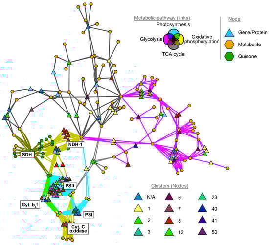 Co-expression of energy metabolism genes in F. thermalis. Gene co-expression clustering (Figure 4) was integrated with the energy metabolism network of F. thermalis (Figure S3). The node color denotes the corresponding gene co-expression cluster. The link color denotes the corresponding metabolic pathway, with intermedial colors indicating an association with more than one pathway. Node labels were omitted to prevent text overlapping. Respiration and photosynthesis complexes are indicated with white labels. Network Cytoscape file can be found in the Supplemental Material.