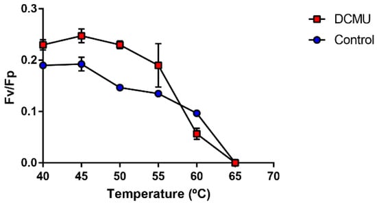 Maximum photosynthetic yield (Fv/Fp) of F. thermalis at different temperatures. Fv/Fp was determined by measuring chlorophyll fluorescence in F. thermals cultures after 2 h of treatment at temperatures from 40 °C to 65 °C. A 2-h preincubation with DCMU (red boxes) or DSMO-control (blue circles) was employed for better Fp measurements. Error bars denote SEM. n = 3.