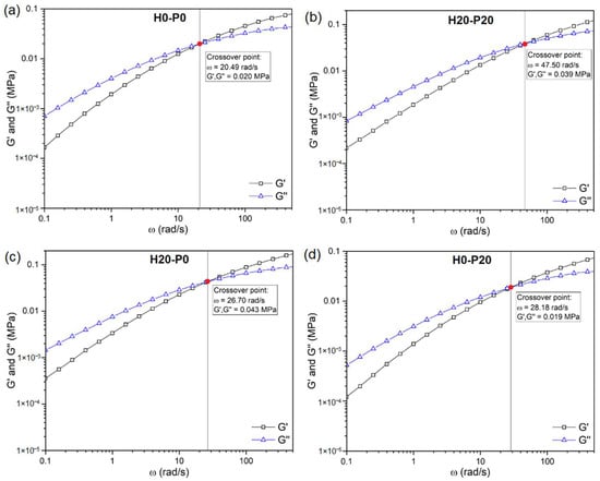 Results of frequency sweep tests on different compositions with the indication of the crossover point. (a) H0-P0, (b) H20-P20, (c) H20-P0, and (d) H0-P20 samples.