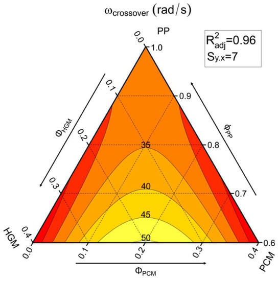 Figure 1 shows that for all the compositions under investigation, below the crossover frequency G″ is higher than G′, resulting in a dominance of the viscous over the elastic behavior. On the contrary, at frequencies higher than the crossover point G″ < G′, because the molten polymer macromolecules do not have enough time to relax the stress []. Considering compositions containing only PCM, from Table 1 it can be noticed that the presence of PCM capsules tends to shift the crossover point to higher frequencies with respect to the PP matrix (H0-P0). On the other hand, in compositions containing only HGM the crossover point is shifted to higher values of G′ and G″. As expected, by combining the two fillers their effects are also combined. For example, the frequency of the crossover point of H20-P20 is 47.5 rad/s, which is higher than that shown by both H20-P0 (26.7 rad/s) and H0-P20 (28.2 rad/s) samples. The crossover frequency of H20-P20 (47.5 rad/s) is the highest one, even when compared to mono-filler compositions with the same amount of filler, such as the H40-P0 sample (21.6 rad/s). These trends are well described in Figure 2, where the crossover frequency of the prepared foams is represented in a ternary diagram.