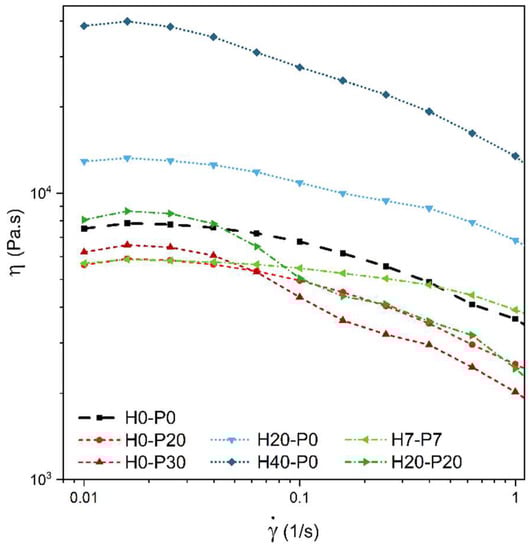 The results of the flow sweep rheological tests on seven representative compositions are reported in Figure 3.