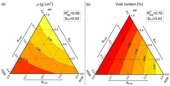 Ternary diagram of (a) the experimental density and (b) the void content of the prepared foams.
