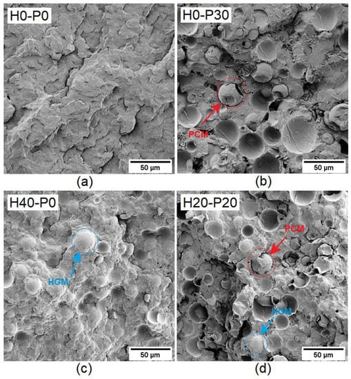 Figure 5a shows the typical fracture surface morphology of polypropylene, while the breakage of the PCM capsules can be clearly seen in Figure 5b (showing the H0-P30 foam). Most of the capsules are broken or deformed, supporting the hypothesis of void generation due to the leakage of the molten PCM (see Table 2). Even if they are partially broken it does not mean that the PCM leaves the composite completely. Indeed, this picture also shows that the matrix is capable of acting as a second shell, avoiding any further loss of PCM. This evidence will be confirmed by DSC results. Moreover, Figure 5b shows a poor interfacial adhesion between the PCM capsules and the PP matrix, while Figure 5c reveals that the silanization process of HGMs and the presence of a compatibilizer in the matrix lead to a good PP/HGM interfacial adhesion. This result could provide a beneficial effect on the elastic modulus and strength of the material, especially under compression. Figure 5d displays the fracture surface of the composition containing both HGM and PCM capsules, and it is confirmed that the presence of HGM beads further increases the breakage tendency of PCM capsules, due to the higher shear stresses developed during the compounding stage. Moreover, this result agrees with the fact that this composition is also the most porous one, as demonstrated in density measurements.