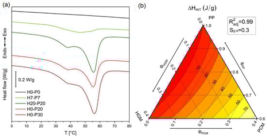 Some compositions do not show phase transitions due to the absence of PCM capsules, as reported in Table 3. For all the compositions containing PCM, Figure 6a shows an increase in the heat stored as the volume fraction of PCM increases. This proportionality can also be clearly seen in the ternary diagram in Figure 6b. The presence of two melting peaks in Figure 6a is due to the presence of paraffin fractions with different molecular weights. Moreover, these results also demonstrate that the PP matrix acts as a second shell, because most of the samples possess enthalpy of fusion close to the theoretical one (ΔHm,th), evaluated considering the PCM content in the foams. For example, H0-P30 has a melting enthalpy of 58.4 J/g, close to the ΔHm,th value of 62.1 J/g. In the sample characterized by the highest porosity degree (i.e., H20-P20) the enthalpy of fusion differs only by 5% from the theoretical one. The discrepancy between melting and crystallization temperatures is due to the thermal inertia of the system and the undercooling phenomena, typical at this heating/cooling rate. By reducing the cooling rate, for example by 1 °C/min, it is possible to get the two temperatures closer [].