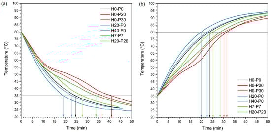 Another method used in this work to investigate TES properties, is the temperature profiling during heating and cooling stages. Seven compositions were chosen to perform this test, H0-P0, H0-P20, H0-P30, H20-P0, H40-P0, H7-P7, and H20-P20. The temperatures of the samples were monitored through K-type thermocouples during heating from room temperature and 100 °C, and during cooling from 100 °C to room temperature. The heating step was conducted in a preheated oven, whereas the cooling step was performed outside the oven. In each step, the time required for the samples to reach a temperature difference between 35 and 80 °C was recorded (t35–80 and t80–35). The temperature profiles obtained both in the heating and cooling stages are shown in Figure 7, while Table 4 lists the results of these tests in terms of t35–80 and t80–35 values.
