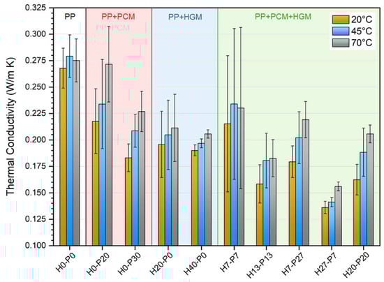 Thermal conductivity is correlated with density, thermal diffusivity, and specific heat by Equation (3). This relationship was applied to the results obtained from the laser flash analyzer (LFA), which gives the thermal diffusivity, to determine the thermal conductivity of the analyzed samples. The tests were performed at three temperatures, 20, 45, and 70 °C, and the resulting thermal conductivity values are presented in Figure 8.