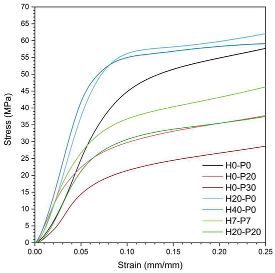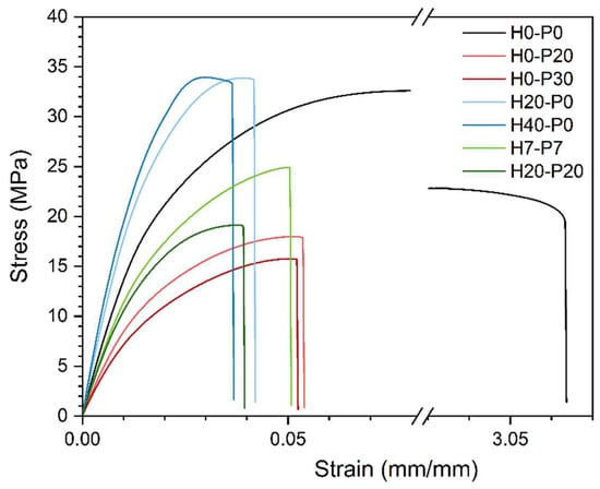 In this work, all the prepared compositions were tested under quasi-static tensile conditions, to evaluate their elastic modulus (Et), stress and strain at yield (σy and εy), and stress and strain at break (σB and εB). The elastic modulus and the stress at the break of the samples were also normalized by their density (Et/ and σB/). Figure 9 reports the representative stress–strain curves of seven selected compositions, while Table 5 lists the most important tensile properties. Moreover, the elastic modulus, stress at break, and their normalized values are represented in ternary diagrams in Figure 10a–d.