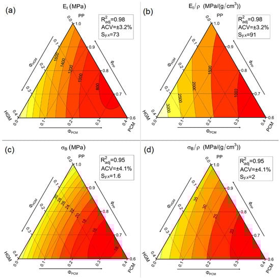 Ternary diagrams of the quasi-static tensile properties of the considered syntactic foams. (a) Elastic modulus (Et), (b) specific elastic modulus (Et/), (c) tensile stress at break (σB), and (d) specific stress at break (σB/).