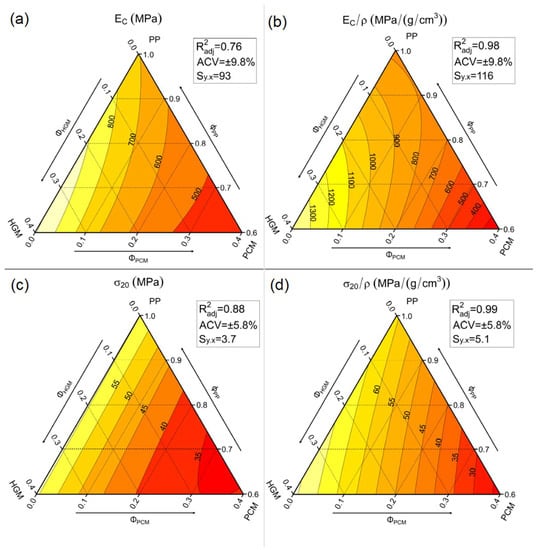 Ternary diagrams of the quasi-static compressive properties of the prepared syntactic foams. (a) Compressive modulus (EC), (b) specific compressive modulus (EC/), (c) compressive stress at 20% (σ20), and (d) specific compressive stress at 20% (σ20/).