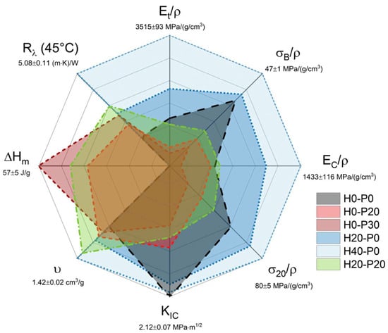 To perform a general comparison between the most important physical properties of the prepared foams, Figure 14 reports in a single radar plot a direct comparison of the performances of the six most representative compositions. This comparative analysis has been conducted in terms of specific tensile modulus (Et/), specific tensile stress at break (σB/), specific compressive elastic modulus (EC/), specific compressive stress at 20% of strain (σ20/), stress intensity factor (KIC), specific volume (ν, that is 1/), melting enthalpy (ΔHm), and thermal resistance at 45 °C (Rλ).