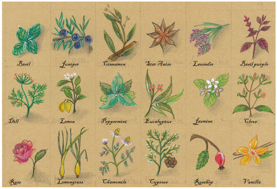 Essential oils (EO) are volatile secondary metabolites produced by aromatic plants and characterized by an intense odor. These natural substances are mixtures of fragrant substances or mixtures of fragrant and odorless substances that are liquid and soluble in both organic solvents and lipids [1,2]. Among these aromatic plants, basil (Ocimum basilicum), lemongrass (Cymbopogon spp.), vanilla (Vanilla spp.), and cinnamon (Cinnamomum verum), among others (Figure 1), are the sources of several specific and very interesting EO with different properties.