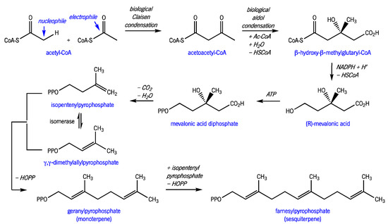 Monoterpene and sesquiterpene biosynthetic pathways. (CoA, coenzyme A; NADPH, reduced form of nicotinamide adenine dinucleotide phosphate; ATP, adenosine triphosphate; HOPP, hydroxy-pyrophosphate; PP, -P(=O)(OH)-O-P(=O)(OH)2 (adapted from [17]).).