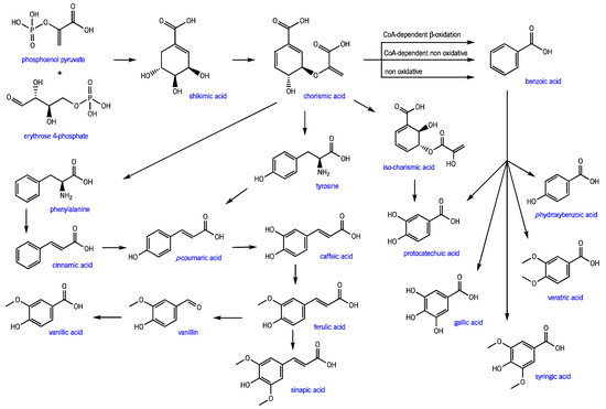 Shikimate pathway for phenolic compound biosynthesis in plants (adapted from [19]).