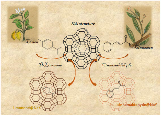 General scheme of the encapsulation of the EO compounds D-limonene and cinnamaldehyde in NaX and NaY faujasite zeolite structures, respectively (adapted from [106]).