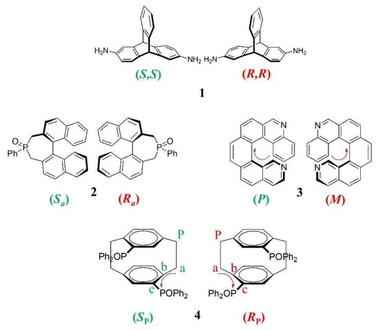 Chemical structures and stereochemical descriptors of enantiomers of chiral compounds 1–4 representative of the four stereogenic elements: 1 central stereogenicity, 2 axial stereogenicity, 3 helical stereogenicity, 4 planar stereogenicity.