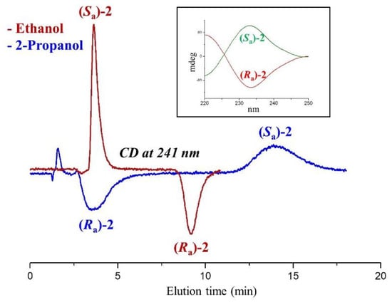 The (Sa)-2 enantiomer was eluted as the first species from the Chiralpak AD-3 column and showed a positive circular dichroism (CD) peak at 241 nm. The offline CD signal assumed the same positive sign at the wavelength of 241 nm (see the CD spectrum depicted in Figure 3). Passing from ethanol to 2-propanol, the sign of the online CD peaks reversed, and the (Ra)-2 enantiomer became the less retained species.