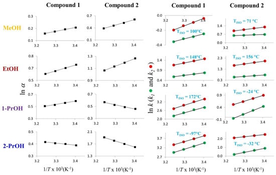 Plots of ln k vs. 1/T ×103 and ln α vs. 1/T ×103 for 1 and 2. Chromatographic conditions: column, Chiralpak AD-3 (100 mm × 4.6 mm, 3 μm); flow rate, 1 mL/min; temperature, 25 °C; detection, CD at 241 nm. 2-PrOH: 2-propanol; 1-PrOH: 1-propanol, EtOH: ethanol; MeOH: methanol.