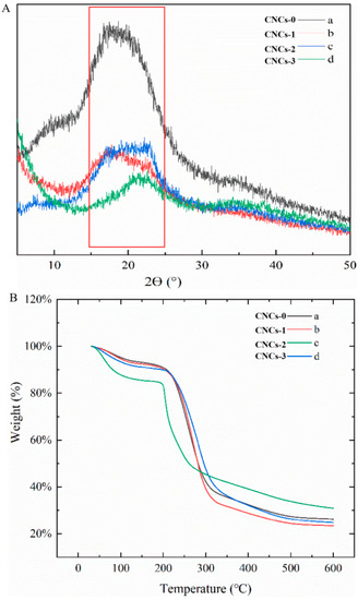 XRD (A) and TGA (B) analysis of CNCs nanocomposite film. CNCs-0 (a), CNCs-1 (b), CNCs-2 (c), and CNCs-3 (d) represented the nanocomposite film with 0, 0.01, 0.05 and 0.1% (w/w) of CNCs incorporation, respectively.