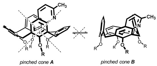 Common lower rim peralkylated calix[4]arenes immobilized in the cone conformation are known to exhibit so called pinched cone—pinched cone interconversion in solution, where two border conformations mutually equilibrate (Figure 4). The above X-ray analysis revealed that the introduction of heterocyclic moiety into the upper rim of calix[4]arenes leads to a single pinched cone conformer in the solid state with substituted aromatic subunits pointing out of the cavity. This means that only one of the two theoretically possible pinched cone conformations is preferred, obviously as a consequence of the steric hindrance minimization within the upper rim.