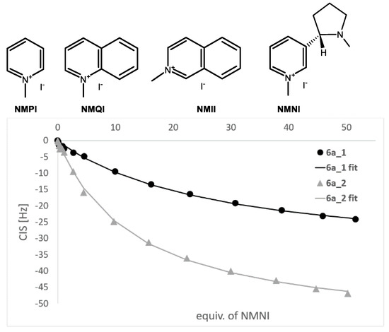 Based on these results, we attempted the enantioselective recognition of (S)-N-methylnicotinium iodide (NMNI) with separated enantiomers 6a_1 and 6a_2 (Figure 4). The resulting complexation constants 37.3 M−1 for 6a_1 and 72.1 M−1 for 6a_2 showed the fairly good ability of our substances in enantioselective recognition of chiral guest molecules.