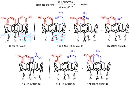 To test the general applicability within the calixarene series, the para-amino-substituted derivative 3 was prepared by the nitration of starting 1 with 100% HNO3 in the presence of glacial acetic acid in dichloromethane [27] and the subsequent reduction of nitro intermediate with SnCl2 [28]. The reaction with acetaldehyde carried out under identical conditions as for 2 (TFA in toluene at 80 °C) provided quinoline derivative 6a in 18% yield (Scheme 1).
