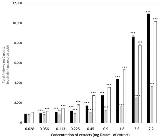 The total phenolic content of the extracts was determined by applying the Folin–Ciocalteu technique as per Singleton et al. [] and Ainsworth and Gillespie []. A volume of 0.8 mL of sodium carbonate (4.25% w/v) was added to 0.2 mL of each plant extract and mixed with 1 mL of the previously diluted 1/10 Folin–Ciocalteu reagent (Sigma-Aldrich, Darmstadt, Germany). Samples were incubated for 2 h, following which their absorbances at 750 nm were determined by using a UV-Vis spectrophotometer (Biochrom Ltd., Cambridge, UK). The total phenolic content was expressed in mg GAE/g DM based on a gallic acid calibration curve.