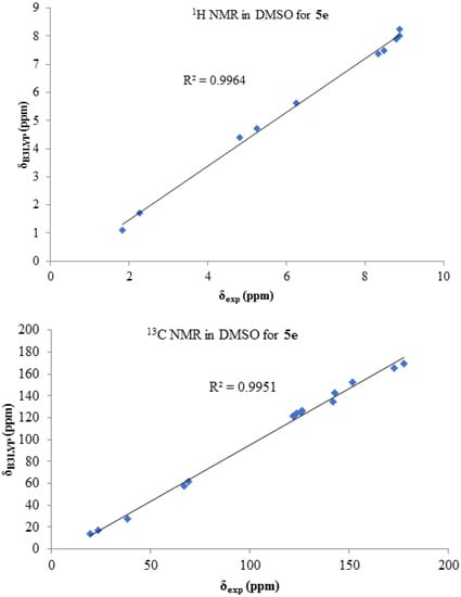 1H and 13C chemical shifts’ correlation between calculated and experimental data for 5e in DMSO.