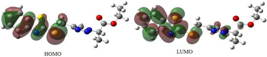 The highest occupied molecular orbital (HOMO) and lowest unoccupied molecular orbital (LUMO) are the frontier orbitals that reveal the ability to donate or accept an electron, respectively. It is worth mentioning that removing electrons from HOMO is easier, and this orbital can donate electrons. As shown in Figure 4, the HOMO and LUMO orbitals are localized mainly on the benzothiazole ring. A useful parameter for determining the organic compound’s reactivity is the gap between the HOMO and LUMO energy levels (Eg). The difference between EHOMO and ELUMO (Eg) is 4.98 eV (Table 4).