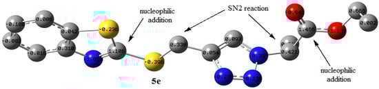 where μ and η are the chemical potential and hardness, respectively, given by Equation (2); 5e has a GEI of 2.94 eV. The GEI can be categorized based on Domingo’s scale [63]. Electrophiles are divided into three groups based on the GEI value: strong, mild, and weak. When the electrophilic index ω is more than 1.5 eV, the electrophile is strong; in the range of 0.8 to 1.5 eV, it is mild, and when it is less than 0.8 eV, it is a weak electrophile. Based on Domingo’s scale, the compound 5e is a strong electrophile and can easily interact with a typical nucleophile. The NBO charge distribution for the structure of 5e is shown in Figure 5. According to the NBO analysis, there is a remarkable excess of positive charge (1.466 e) on the carbon atom of the carbonyl group. The study also indicates that the carbon atom of the imine unit (N = C) in the benzothiazole ring, methylene (-SCH2-), and –NCH- bear a positive charge of 1.106, 0.338, and 0.421e, respectively. NBO analysis and the electrophilicity index of 5e show that a nucleophile can attack these positive carbon centers. Possible nucleophilic centers in 5e, based on NBO analysis and the electrophilicity index, are shown in Figure 5.
