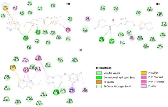 All compounds 5a–f can bind to the active site of the protein targets. The synthesized compounds can form hydrogen bonds (H-bond) with the amino acids in the active site of the protein targets. The number of H-bonds of 5a–f with the related protein targets is collected in Table 6. H-bond interactions were found between nitrogen atoms on the triazole ring of the compounds 5a–f and amino acids in the active site of the protein targets, indicating that the triazole unit of the synthesized compounds could be the key to binding and inhibiting the protein (Figure 6).