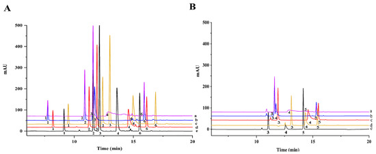 Effects of different compositions of mobile phase on the HPLC chromatogram of coccidiostats at 270 nm (A) and 340 nm (B): 1, clopidol; 2, dinitolmide; 3, sulfaquinoxaline; 4, robenidine; 5, nicarbazin; 6, diclazuril. The composition of mobile phase: a (pink colour), acetonitrile-water; b (blue colour), methanol-water; c (red colour), methanol-5 mmol/L ammonium acetate aqueous solution; d (yellow colour) , methanol-10 mmol/L ammonium acetate aqueous solution; e (black colour), methanol-5 mmol/L ammonium acetate aqueous solution (containing 0.1% formic acid).