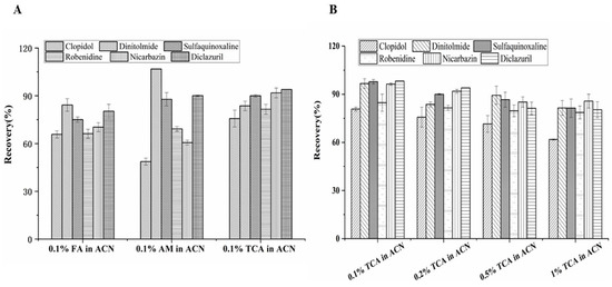 MeOH and ACN were commonly used to extract coccidiostats [15,20]. Many impurities were co-extracted from the chicken feed when MeOH was used. Although ACN could reduce the co-extracted impurities, the recoveries of nicarbazin and robenidine were lower than 60%, perhaps because of their strong affinity with feed. The acidified and alkalized ACN were optimized to obtain favorable recoveries of six coccidiostats. As shown in Figure 2A, alkalized ACN (0.1% AM in ACN) could not effectively extract clopidol and nicarbazin, with their recoveries lower than 60%. As a protein denaturant, trichloroacetic acid (TCA) improves the release of coccidiostats from feed samples by changing protein conformation and precipitating proteins. However, the more TCA was used, the lower recovery of clopidol showed (Figure 2B). When the ratio of TCA reached 1%, the recovery of clopidol was only 61.8%, suggesting that the clopidol could degrade dramatically under low pH. It needs further study to assess how the pH affects the stability of clopidol. Therefore, ACN containing 1% FA was selected as the extract solution.