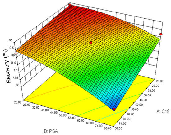 Response surface methodology has the advantages of fewer experiments, high accuracy, and good model predictability, which is widely applied in the removal of pollutants [26] and the extraction of active ingredients [27]. To obtain the optimal conditions of DSPE, a center combinatorial design (CCD) test for two factors (the mass of C18 as factor A and PSA as factor B) was carried out to investigate the interaction between the variables. The CCD test contained 13 random experiments. The design and results of 13 random experiments are given in Table S2. The three-dimensional overall desirability (D) response surface plot for the factors is exhibited in Figure 4. The optimum conditions were: 50 mg of C18 and 50 mg of PSA, and the predicted recovery was 87.5%. The recovery test was repeated three times under the optimal conditions and the result was consistent with the predicted value, indicating that the conditions obtained by the response surface methodology were reliable.