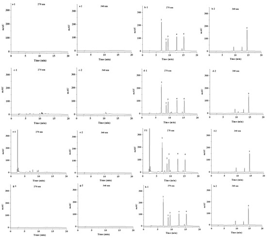 Typical HPLC chromatograms at 270 nm and 340 nm of (a) reagent blank, (b) reference solution (2 μg/mL), (c) blank matrix of chicken premix, (d) spiked chicken premix at the concentration of 20 mg/kg, (e) blank matrix of chicken complete feed, (f) spiked chicken complete feed at the concentration of 20 mg/kg, (g) blank matrix of chicken feed additive, and (h) spiked chicken feed additive at the concentration of 20 mg/kg, with peak identification as follows: 1, clopidol; 2, dinitolmide; 3, sulfaquinoxaline; 4, robenidine; 5, nicarbazin; 6, diclazuril.