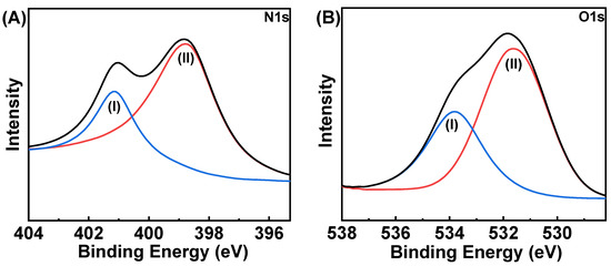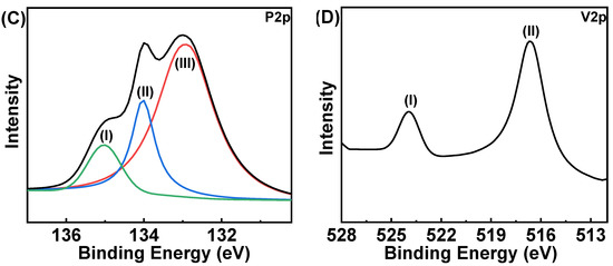 To further characterize the detailed structure of HCCP-V, X-ray photoelectron spectroscopy (XPS) was used. As shown in Figure 2A,B, the successful introduction of V6O13-PhOH to the polymeric framework can be proven by the presence of N1s signals from N–H of TBA+ at 401.1 eV and P=N at 398.8 eV, as well as the O1s signals from C–O–P at 533.8 eV and V–O at 531.6 eV. Moreover, the P2p signals at 135, 134, and 132.9 eV (Figure 2C) can be assigned to P–Cl (I), P=N (II), and C–O–P (III), respectively, indicating that most of the phosphazenes were involved in the cross-linked framework [14,39,40]. Furthermore, as shown in Figure 2D, the signals of V2p at 524 and 516.7 eV indicated that the valence state of V mostly retained +5, demonstrating that their redox properties were retained in the resulted HCCP-V, and enabled their potential application in the selective oxidation of sulfides.