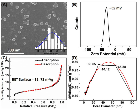 (A) SEM image of HCCP-V dispersed in EtOH, inset is a size distribution based on the SEM image. (B) Zeta potential result for the dispersion of HCCP-V in H2O. (C) N2 isotherm adsorption and desorption curve (C) and pore size distribution (D) of HCCP-V.