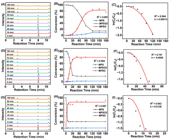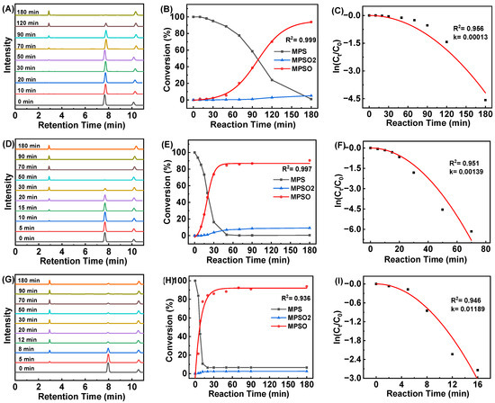 HPLC, conversion, and kinetics curves during the catalytic oxidation of MPS by 1/400 eq of HCCP-V and 1.0 eq of H2O2 at different temperatures: (A–C) 25 °C, (D–F) 40 °C, and (G–I) 55 °C. Naphthalene with a retention time of 10.2 min was used as an internal standard.