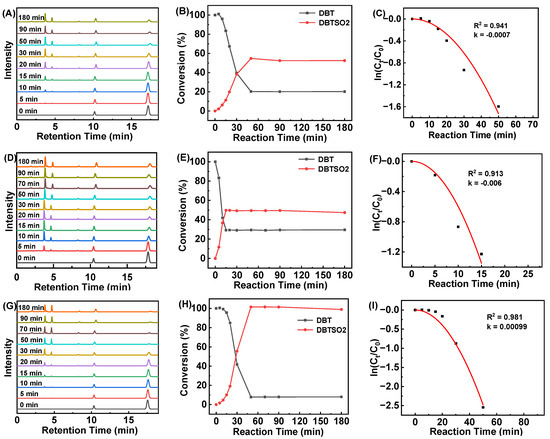 HPLC spectra, conversion curves, and kinetics curves during the catalytic oxidation of DBT by HCCP-V under different conditions: (A–C) 70 °C, 5 eq of H2O2, (D–F) 80 °C, 5 eq of H2O2, and (G–I) 70 °C, 8 eq of H2O2. Naphthalene with a retention time of 10.2 min was used as an internal standard.
