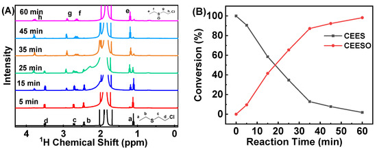 Catalytic oxidation of CEES by HCCP-V:H2O2 = 1:1.2 at room temperature: (A) 1H NMR spectra of the catalytic oxidation process (CDCl3). (B) The conversion curves of CEES and CEESO.