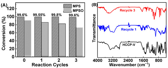 (A) The conversion of MPS and MPSO during 4 cycles of reuse of HCCP-V. (B) FT-IR spectra for the catalyst HCCP-V during 4 cycles of reuse.