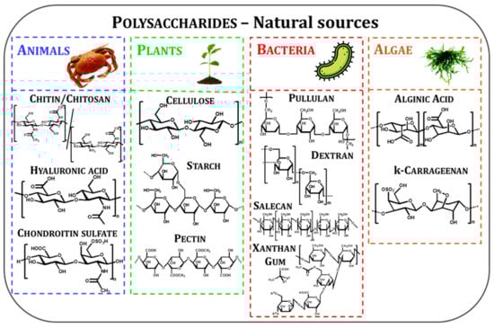 - animal polysaccharides: chitin (CT)/chitosan (CS), hyaluronic acid (HA), chondroitin sulfate (CRS), etc.;